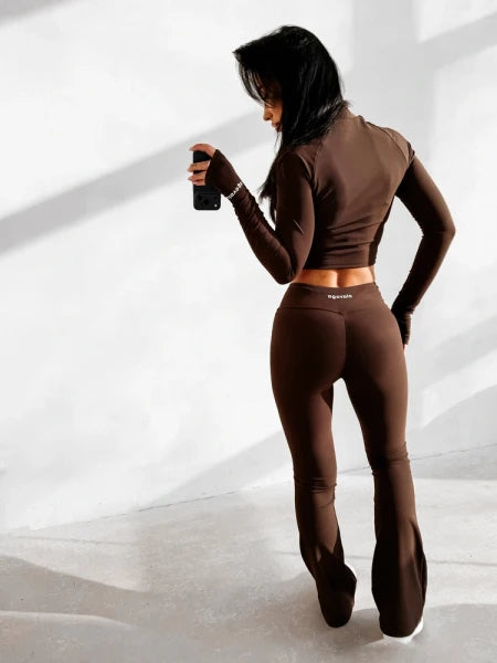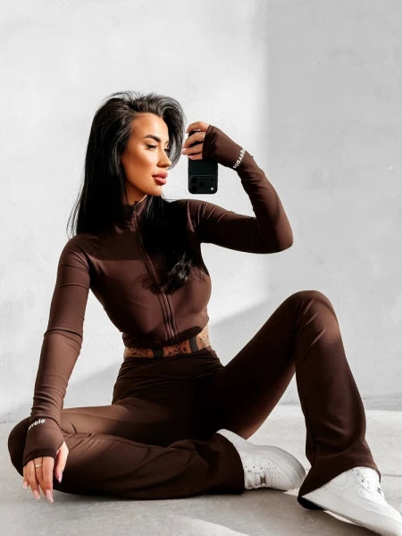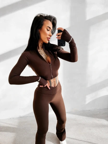 Komplet dopasowany wykonany z elastycznej, miękkiej tkaniny. Legginsy z modelującym pasem podkreślającym sylwetkę oraz subtelnym logo OLAVOGA. Krótka bluza zapinana na suwak. Legginsy z wysokim stanem. Ważne aspekty: dopasowany, modelujący krój, elastyczna komfortowa tkanina, legginsy z wysokim, modelującym pasem, subtelne logo OLAVOGA, krótka bluza zapinana na suwak.