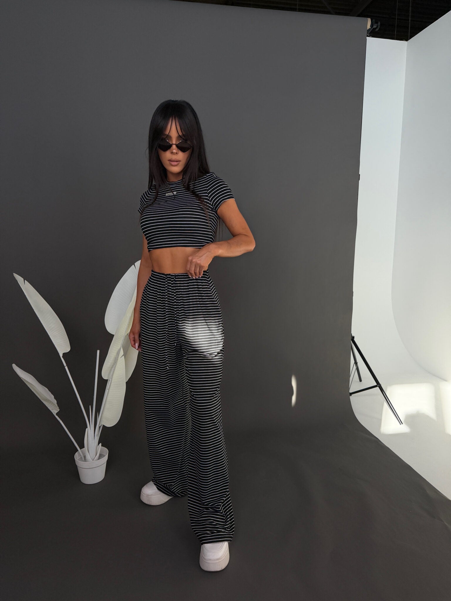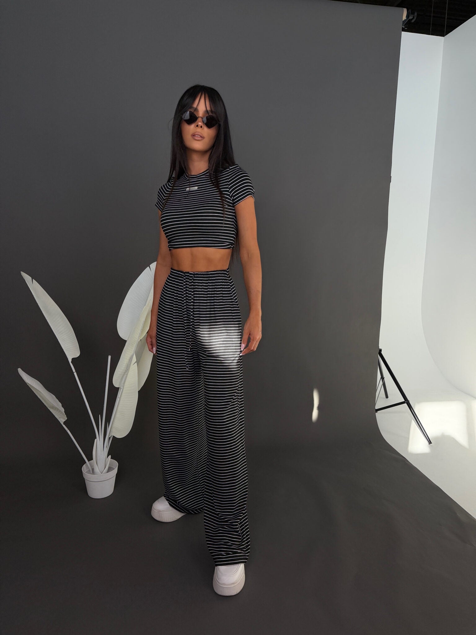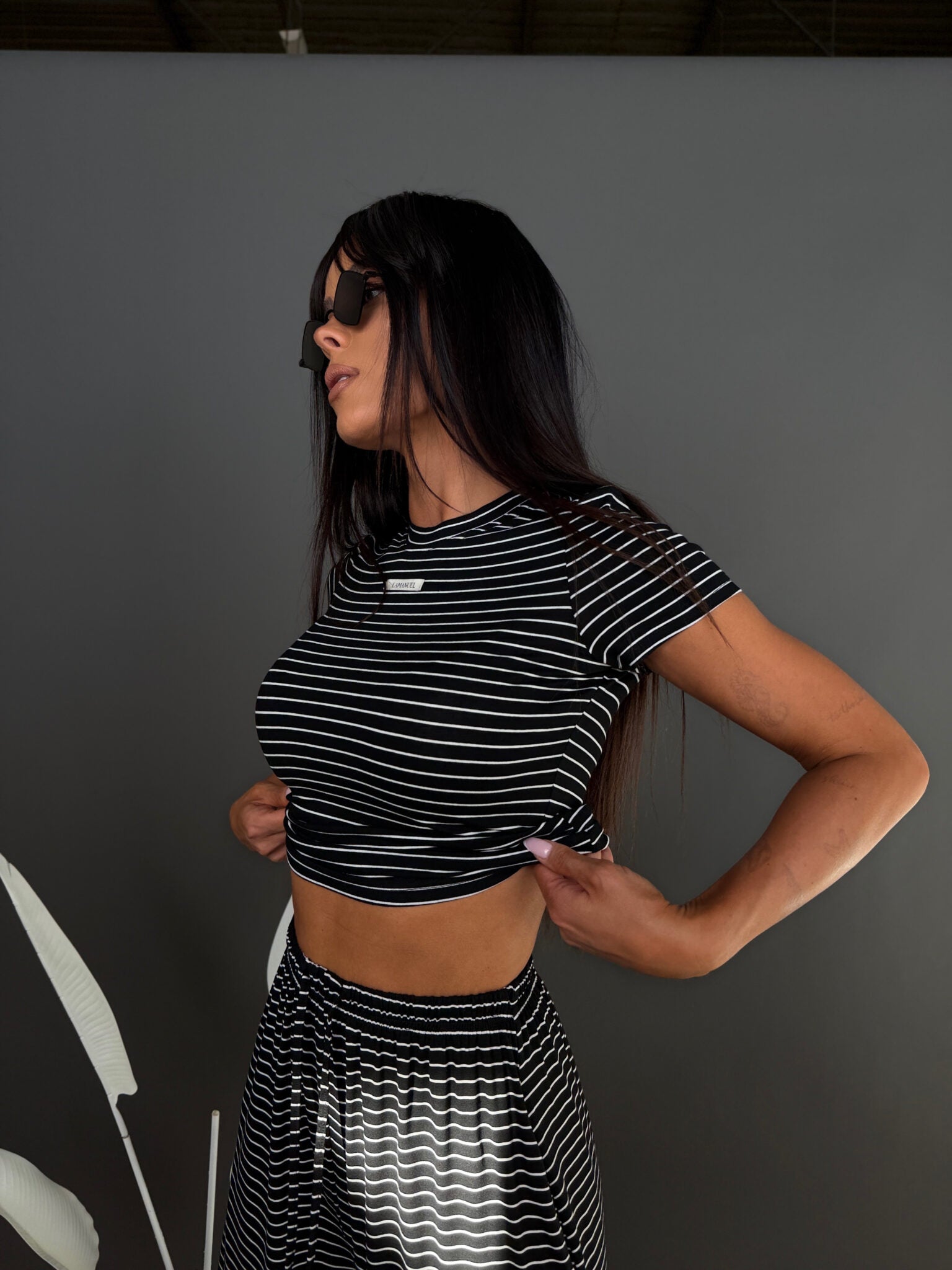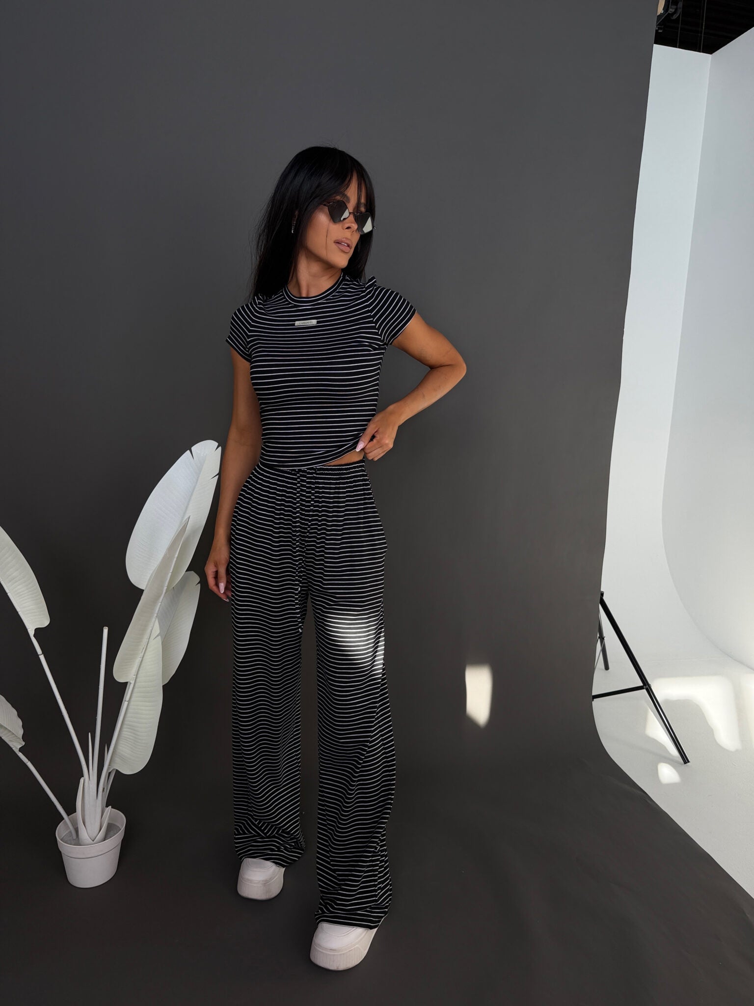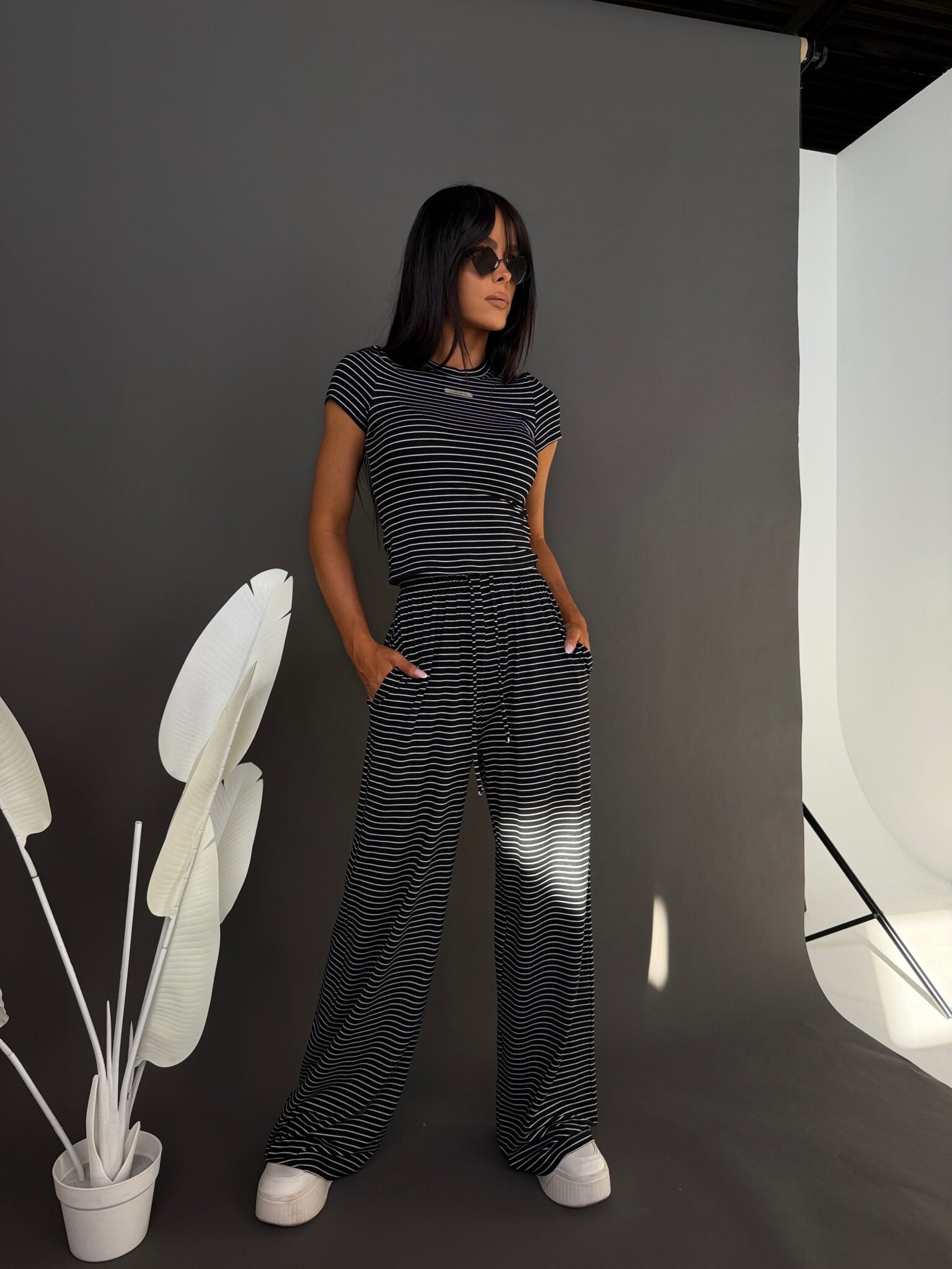 Komplet z miękkiej, lejącej wiskozy, która nadaje całości lekki i swobodny charakter. Dłuższy top o klasycznym kroju dobrze układa się na sylwetce i stanowi zbalansowaną górę dla luźniejszych spodni. Delikatne paski podkreślają casualowy styl modelu, a szeroka nogawka dodaje mu luzu i nowoczesnej formy. To wygodny, gotowy look, który nie wymaga wielu dodatków.